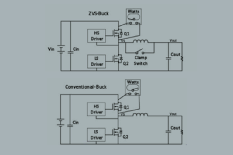 A better solution uses zero-voltage-switching (ZVS) topology, which allows for operation at a higher frequency and at higher input voltages without sacrificing efficiency. While still PWM based, a separate phase is added to the PWM timing to allow for ZVS operation. Figure 1 compares a conventional buck regulator with a version modified for ZVS operation. Utilizing the added phase, the ZVS type uses the clamp switch and circuit resonance to operate the high side (Q1) and synchronous (Q2) MOSFETs efficiently with soft switching, avoiding the losses they incur during conventional PWM operation and timing.